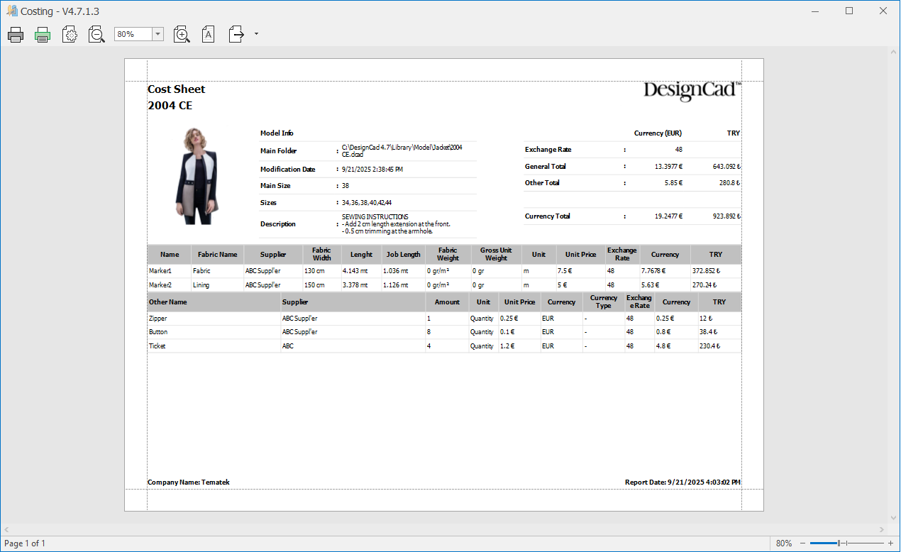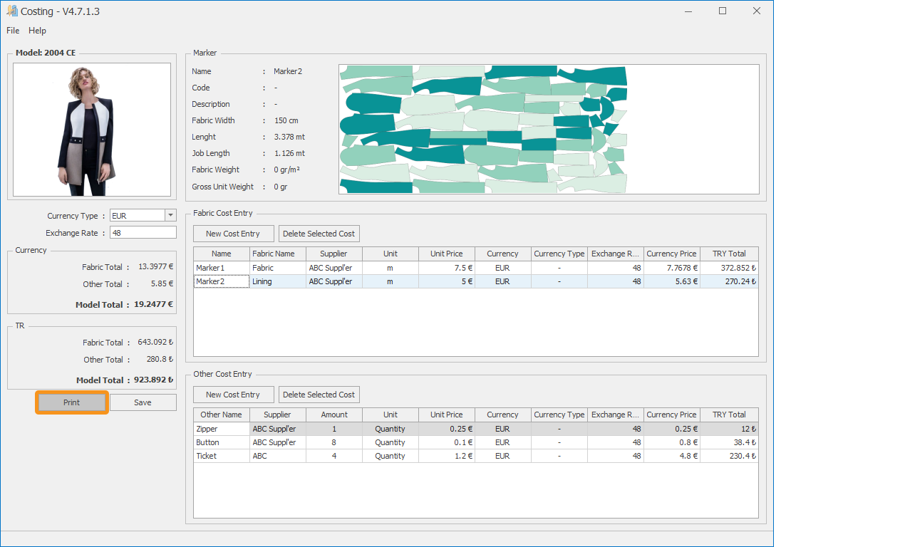 After all cost entries are completed, the generated cost table can be printed using the Print button or saved in different file formats (Excel, Word, PDF, etc.).