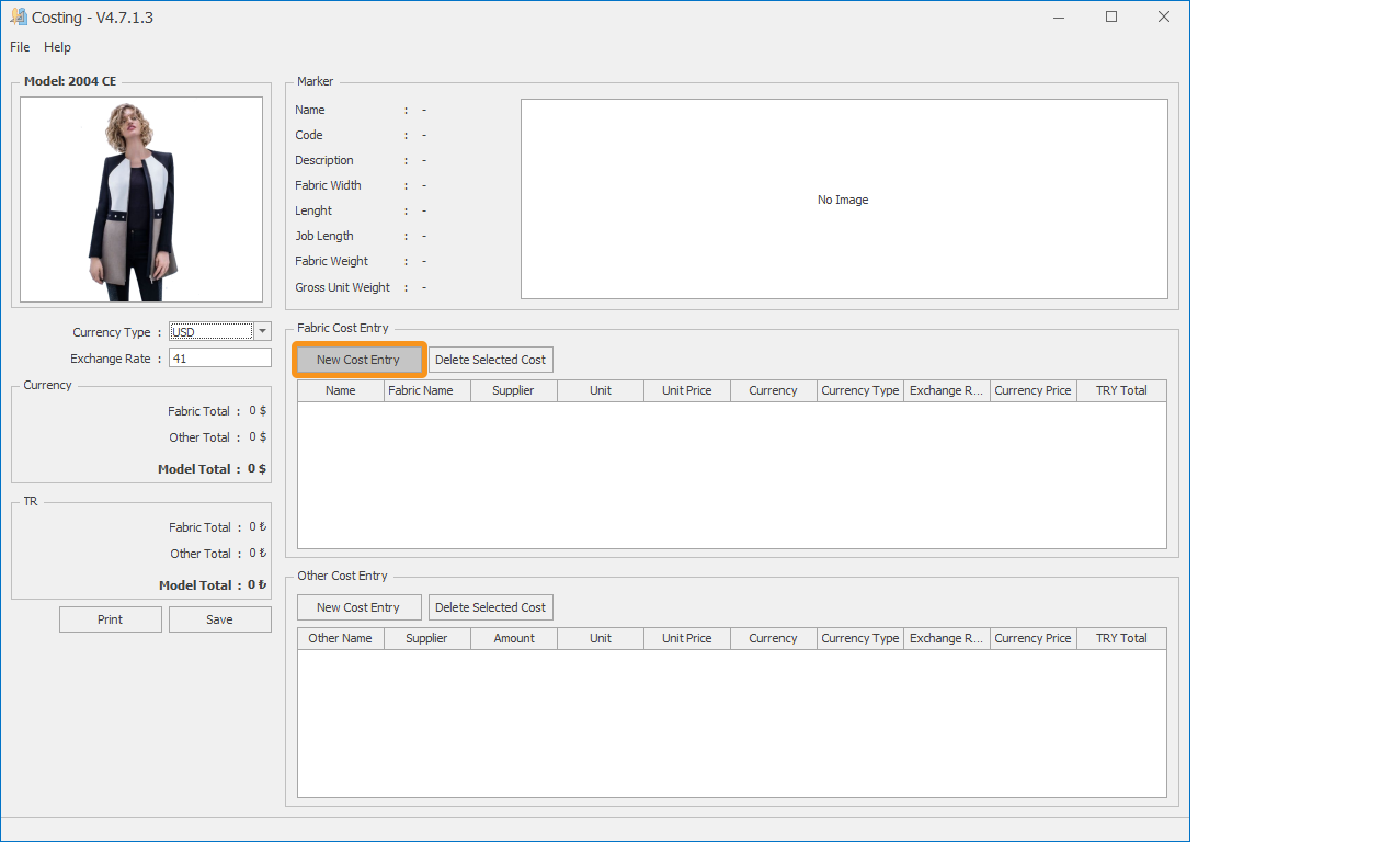 The Costing window opens. In the opened window, for fabric cost entry, click the Add New Cost button in the Fabric Cost Entry section.
