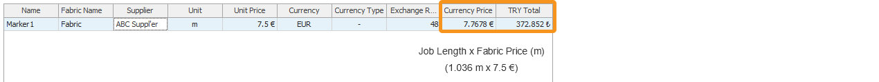 The fabric cost of the marker for a job is displayed in both foreign currency and Turkish Lira (TL).