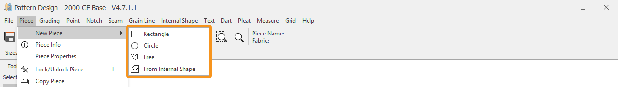 1.) In the Pattern Design screen, click New Piece > From Internal Shape from the Pieces menu.