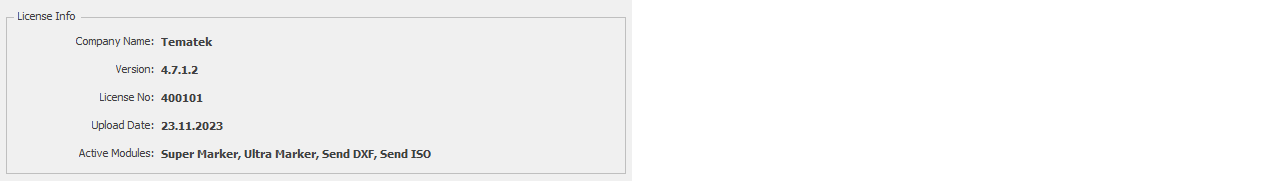 In the License Info section, the company name where the DesignCad software is installed, the version, the license number, the installation date, and the active modules belonging to this license are displayed.