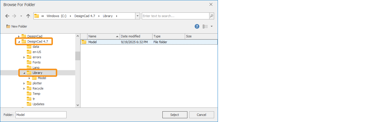 From the opened window, the DesignCad library path is selected and the Select button is clicked. (During the initial installation, C:\DesignCad 4.7\Library\Model is set as the default library.)
