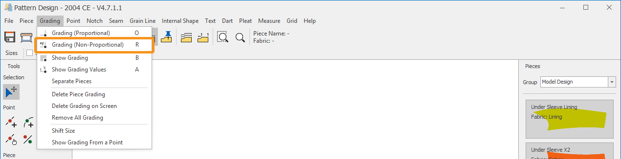 In the Pattern Design screen, click the Grading (Non-Proportional )