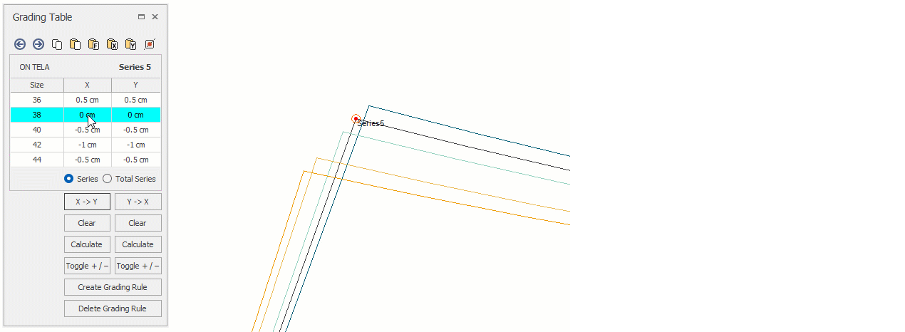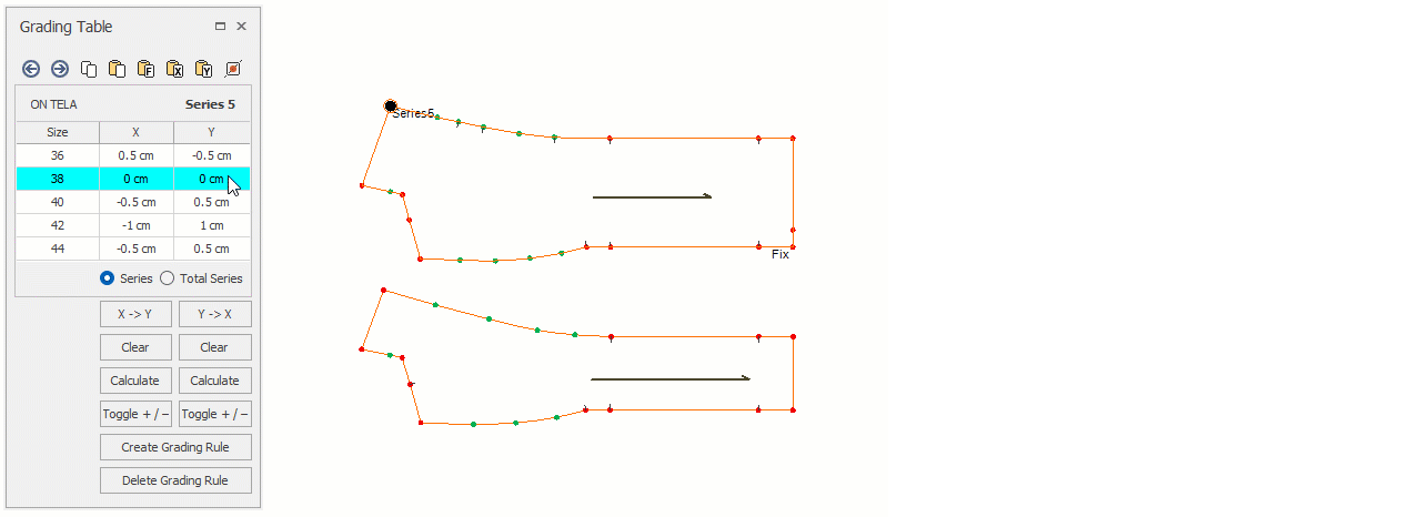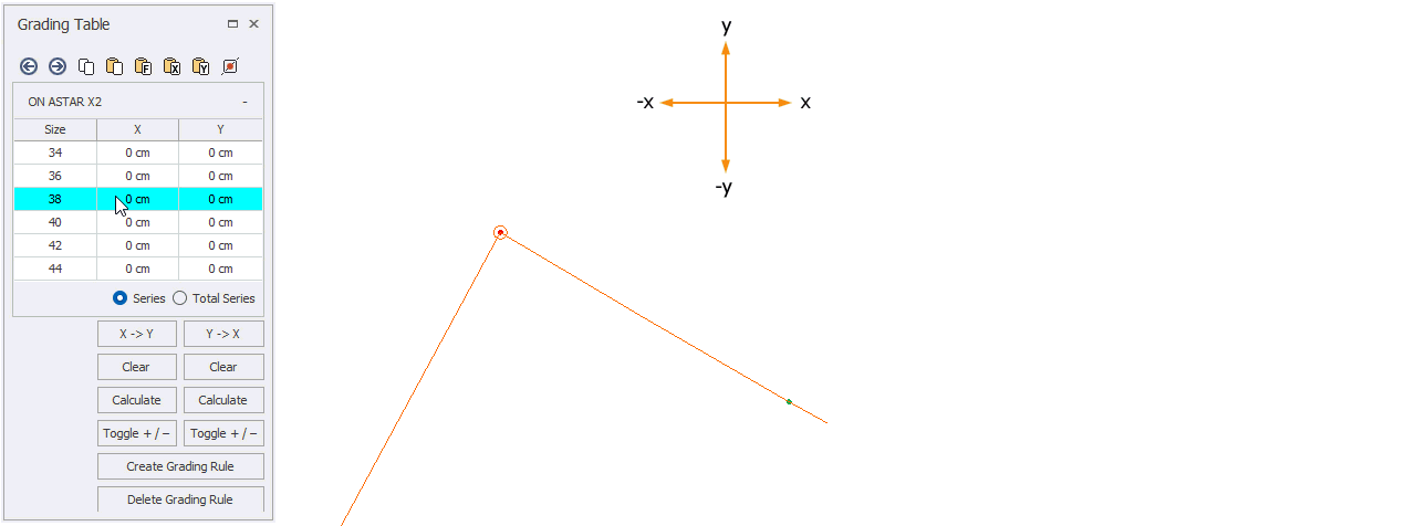 In the table, X and Y columns are used to enter the differences between sizes, which are then assigned as grading values to the selected point.
