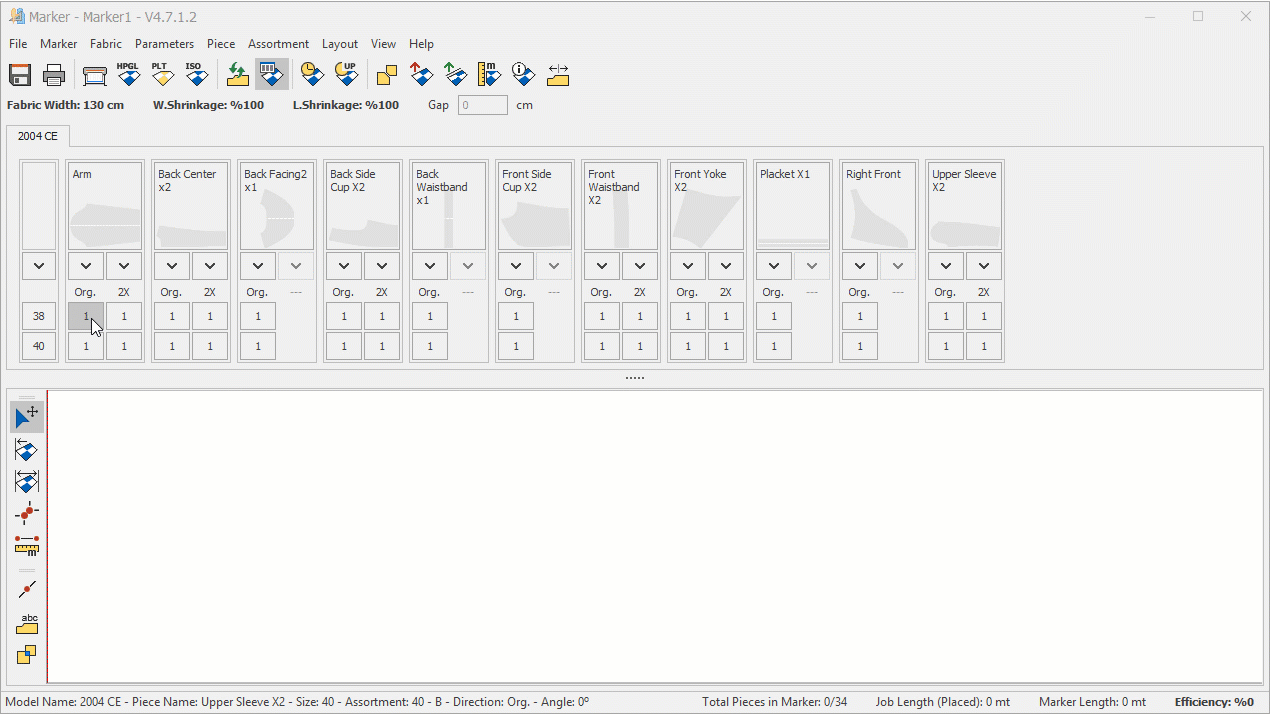 Piece Bar: Shows the quantities of pieces included in the marker plan, listed by size and orientation.
