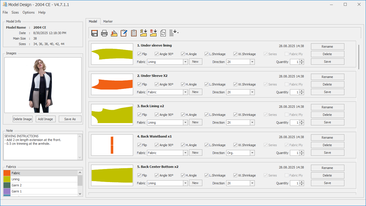 Marker Information: A window opens containing fabric, shrinkage, efficiency, meterage, and area information for the selected marker. | |