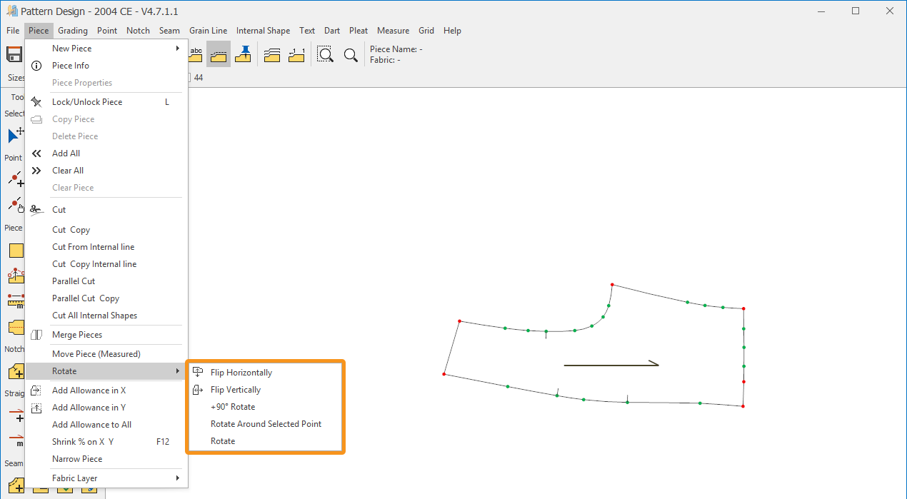 - In the Pattern Design screen, go to Pieces > Rotate > Flip Horizontal