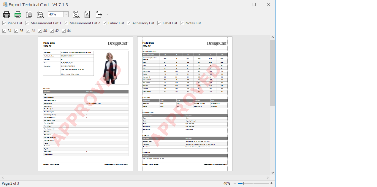 The Technical Sheet Export window opens.