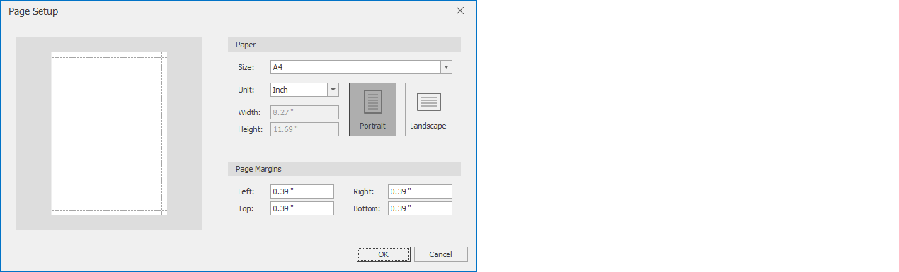 Page Setup: Configures the printer page settings (size, orientation, and margins are adjusted).