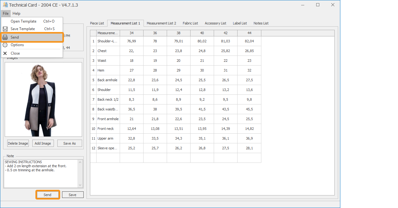 From the Technical Sheet File menu, click Send, or click the Send button in the Technical Sheet window.