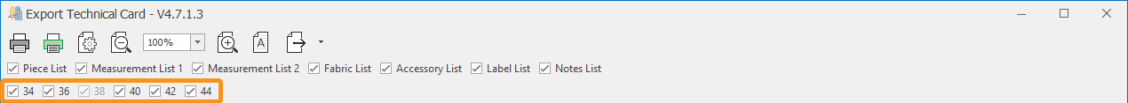 In the top menu, all sizes belonging to the model are selected by default in the bottom row.