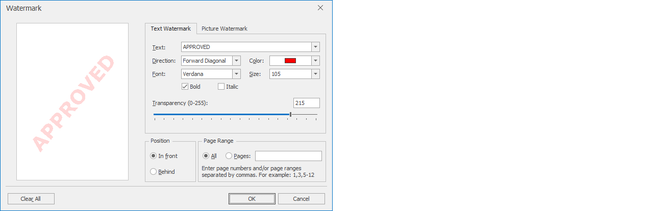 Watermark: From the opened window, warning texts can be added to the page to be printed (for example: seen, approved, etc.).