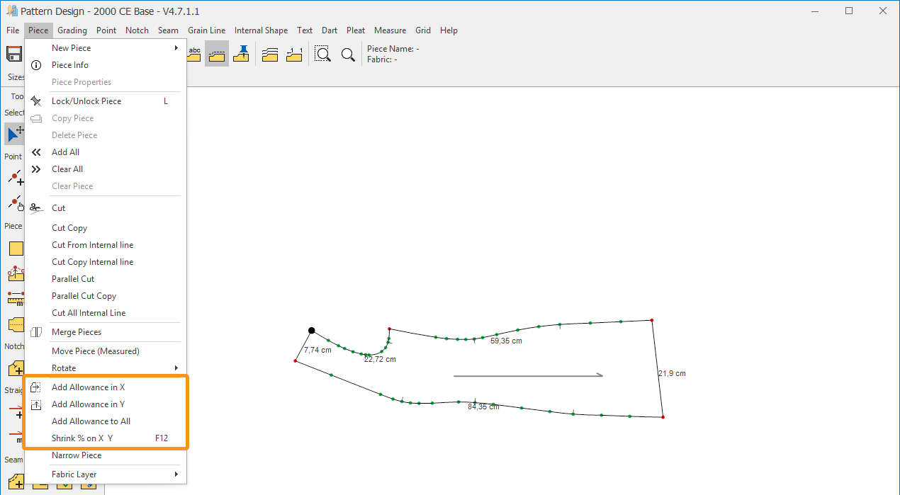 1.) In the Pattern Design screen, select the piece to which the ease/reduction will be applied.