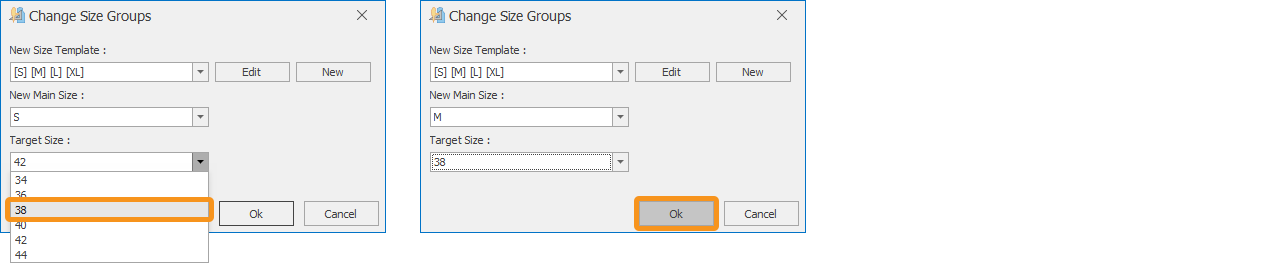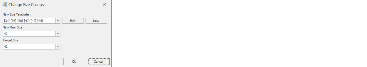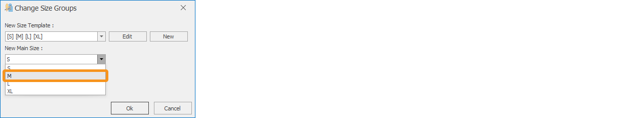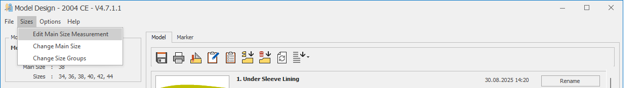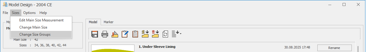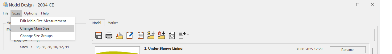 With this function, you can change the size group of the model, assign a new size group to the model, and select a new main size based on the new group.