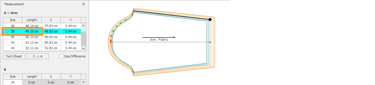 For example, if the measurement of a line in size 38 is 47.14 cm, after this operation, the measurement of size 38 becomes 49.13 cm.