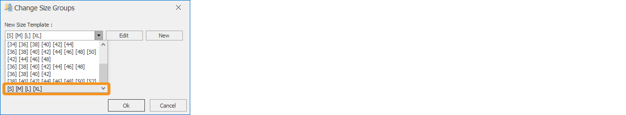 A new size group is selected for the model from the pop-up window. If the desired size group is not listed or if a modification is needed in an existing size group, the Edit option is used to make the necessary changes before selecting the size group.
