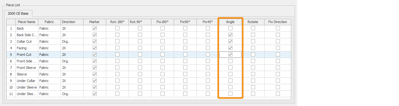 In the Angle section, each piece selected in the piece list of the marker is rotated by the entered angle value relative to its grainline, either clockwise or counterclockwise, to achieve the most optimal marker.