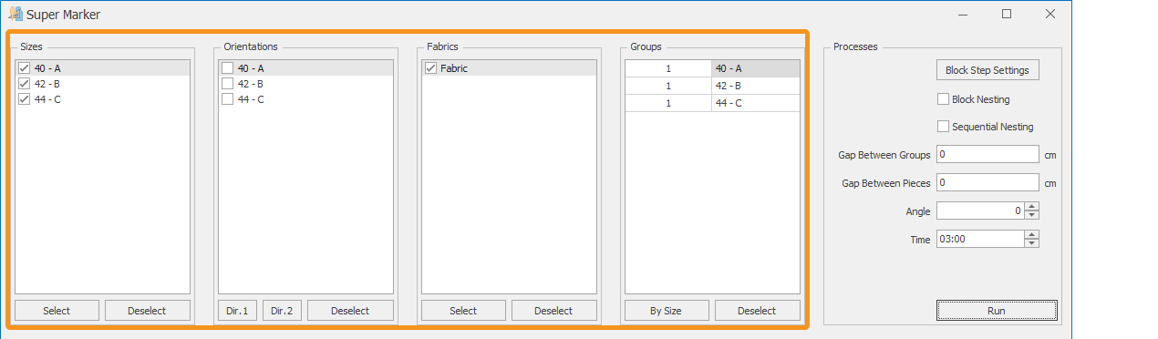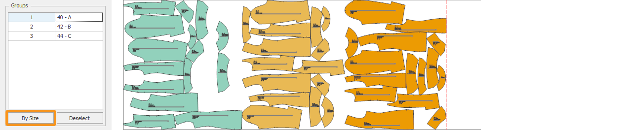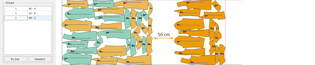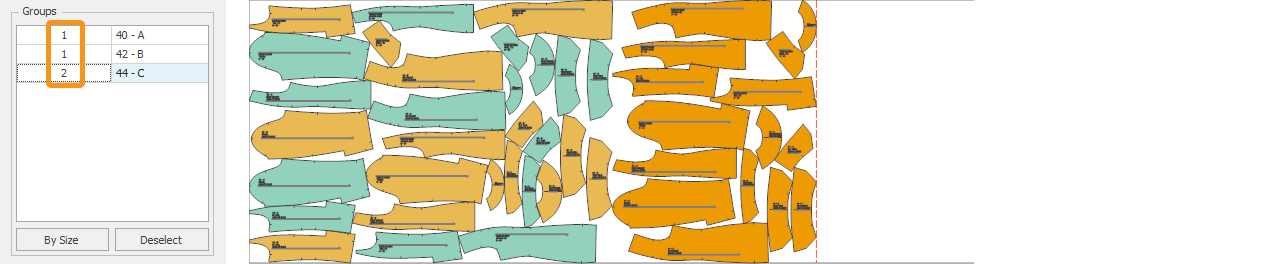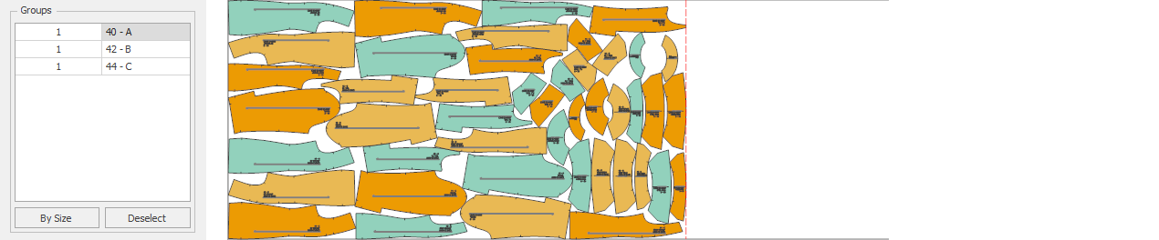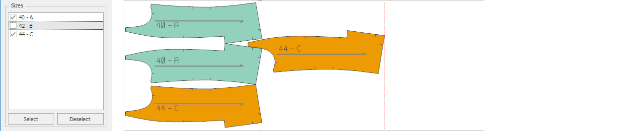 For example: Parts belonging to sizes 40-A and 42-B will go to the Super Marker together in the first sequence (mixed), while the parts belonging to size 40-A only will be placed in the second sequence.