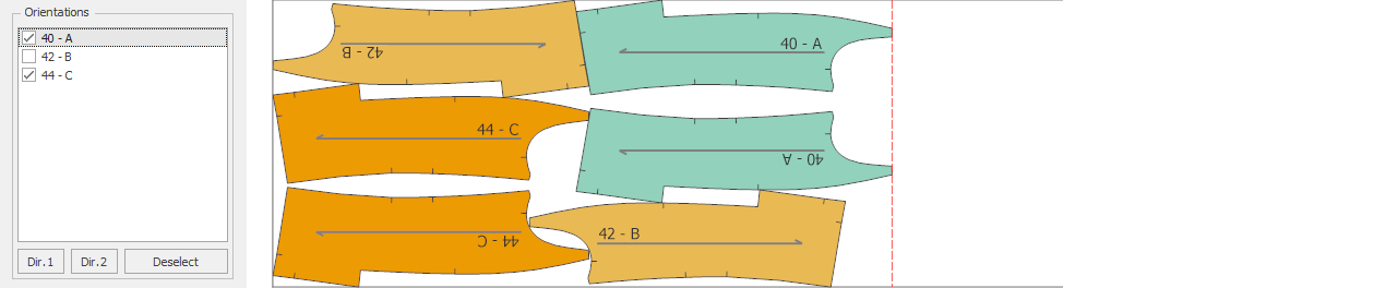 With the Direction 1 and Direction 2 buttons, sizes can be placed alternately (one upright, one reversed) according to their grain line in the marker.