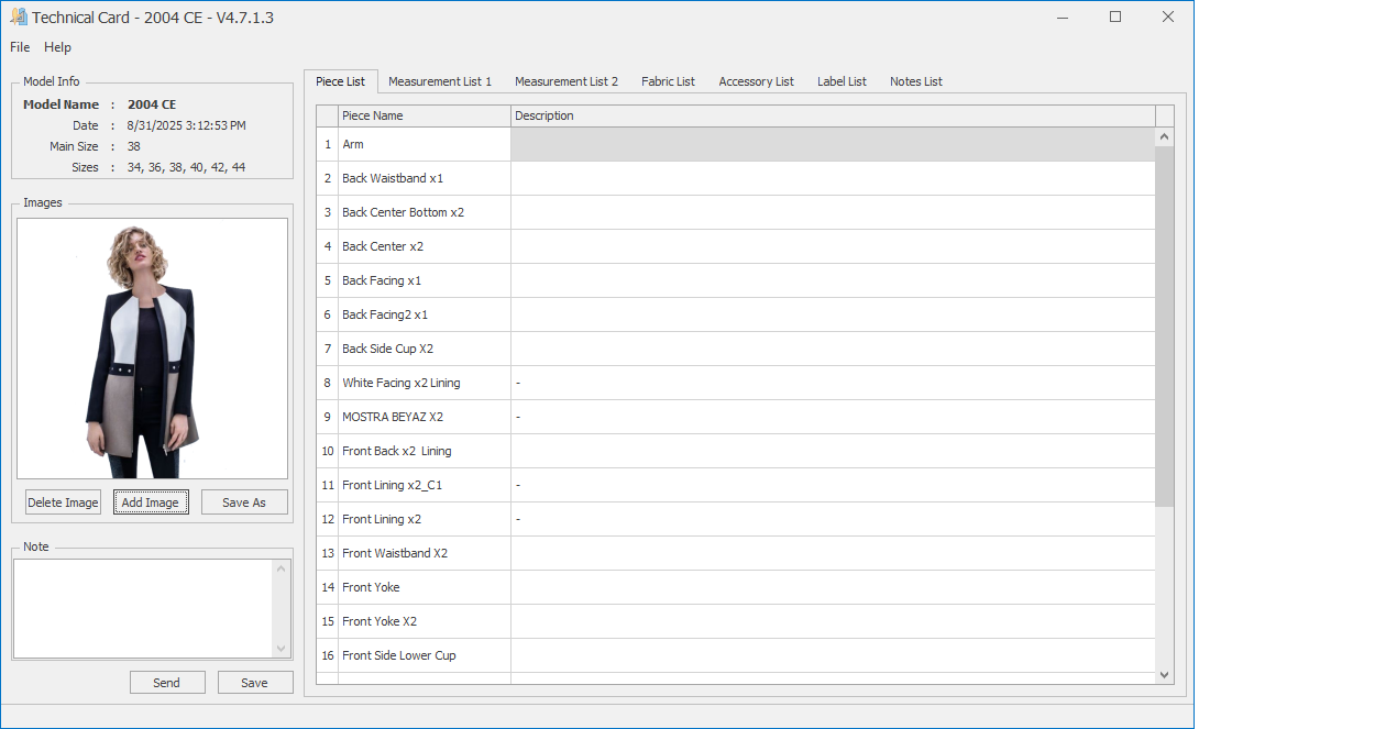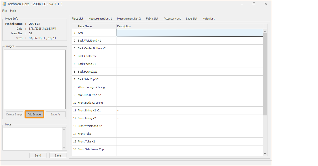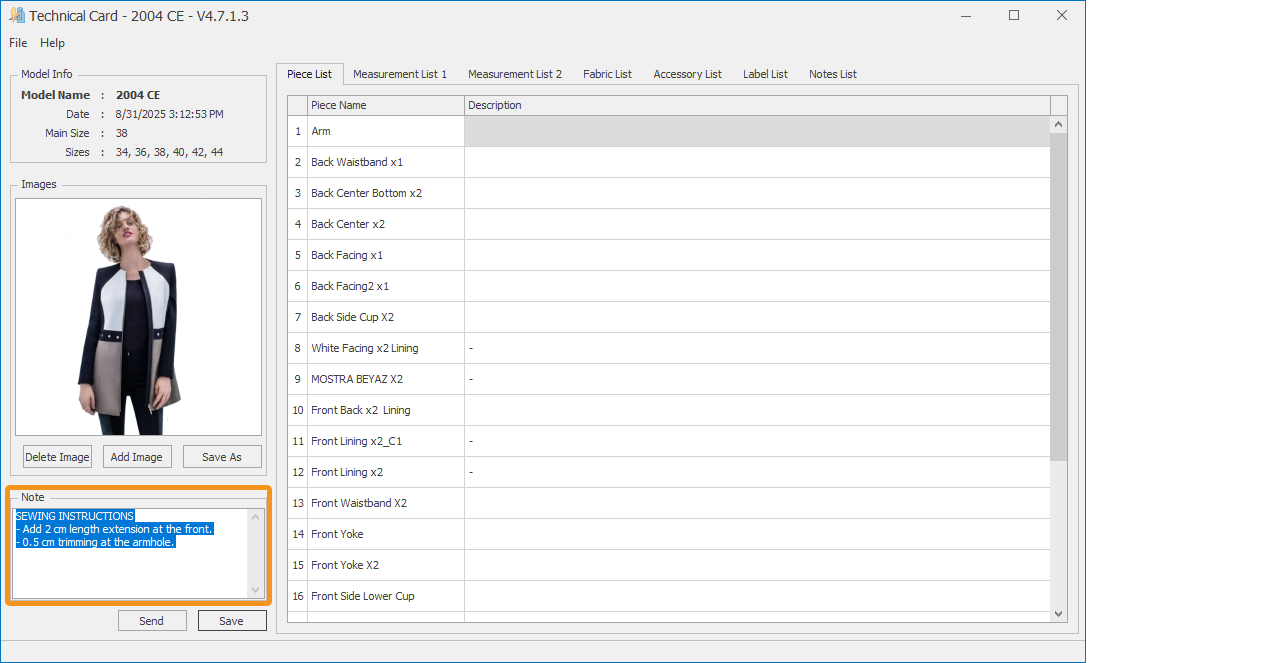 To add a note to the Technical Sheet, click the Note section with the mouse, write the note related to the model, and save it by clicking the Save button.