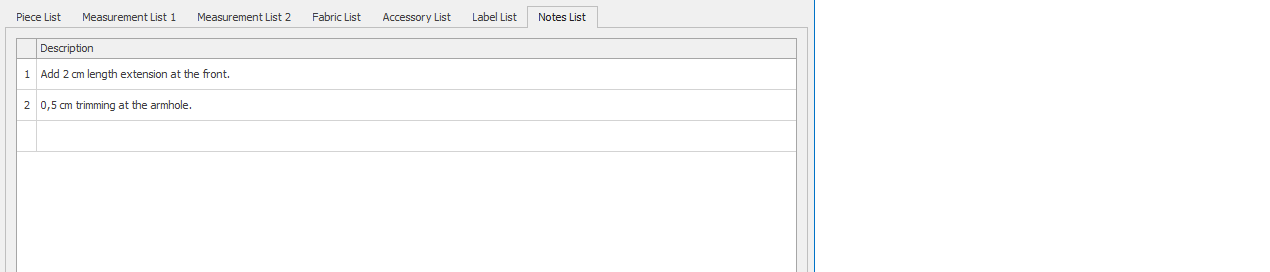The Notes List tab is the section where the production notes related to the model are stored.