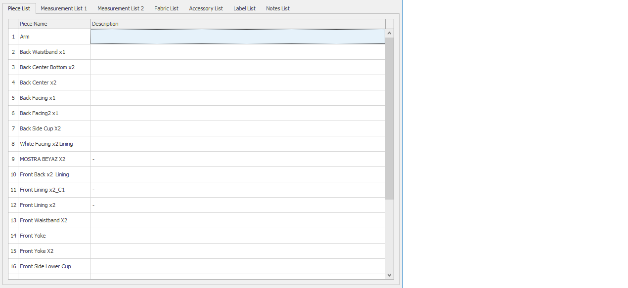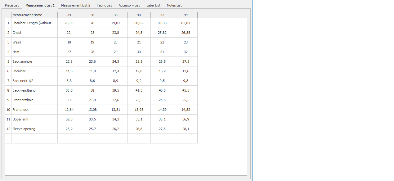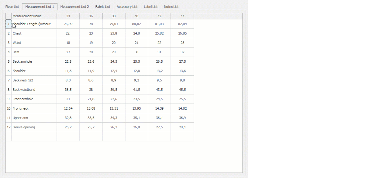 In the Measurement List 1 and Measurement List 2 tabs, the size list of the piece is displayed.