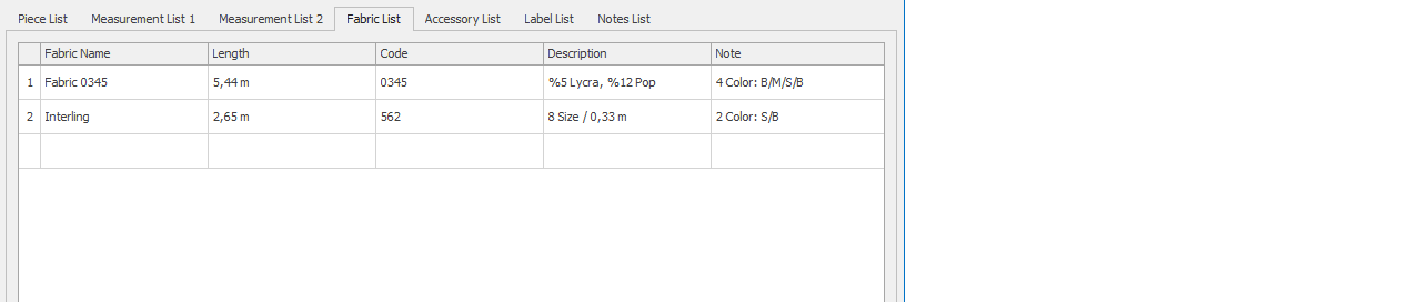 The Fabric List tab is the section where information such as the name, length, and code of the fabrics to be used in the model is stored.