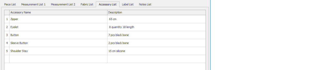 The Accessories List tab is the section where the information of the accessories to be used in the model is stored.