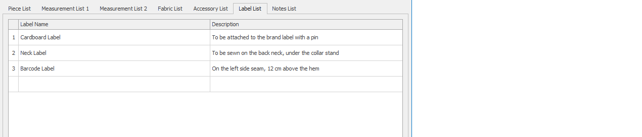 These are the tabs where information such as pieces, measurements, fabrics, accessories, and labels related to the model is entered.