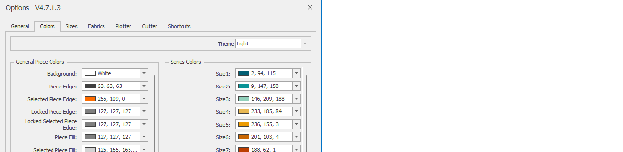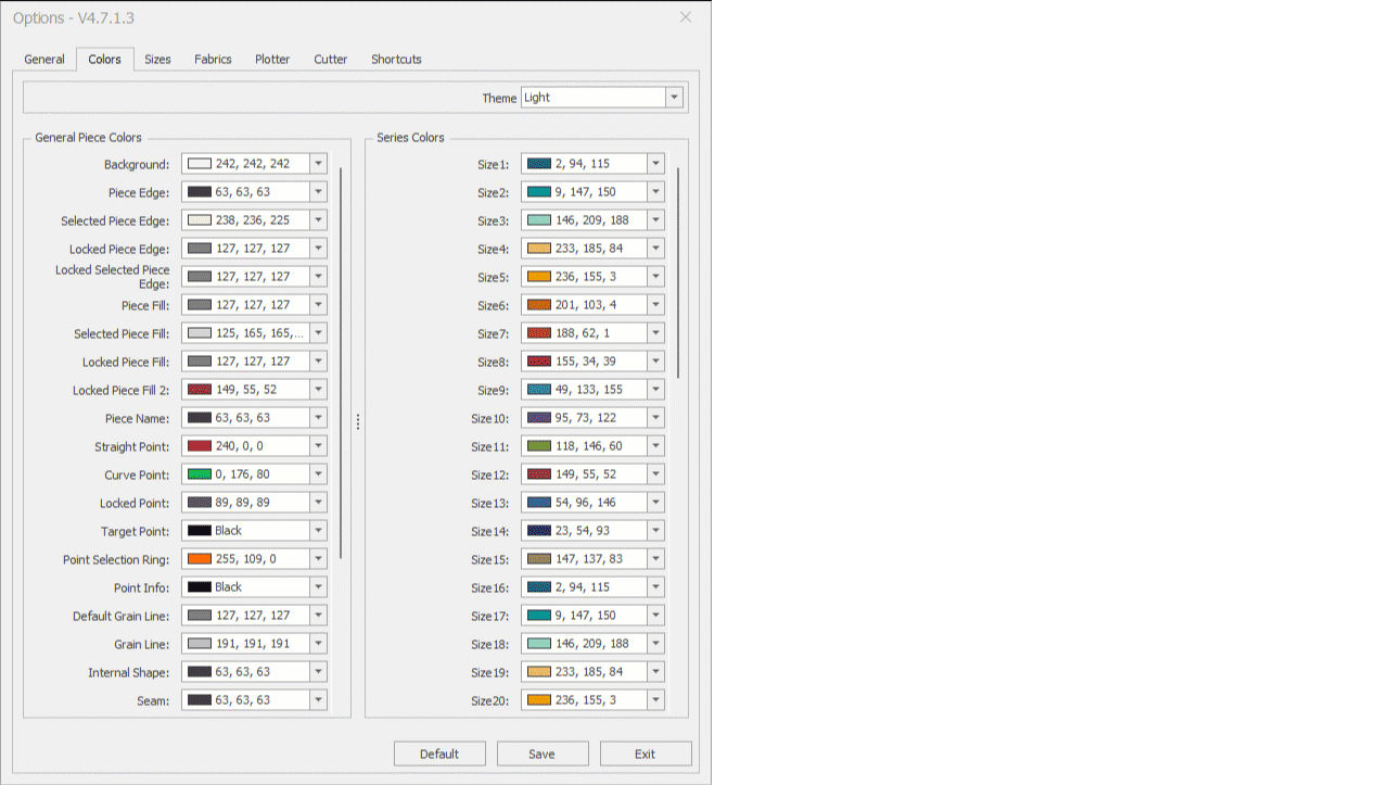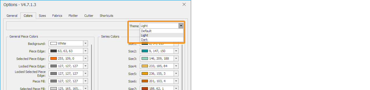 In the Colors tab, click the Theme box. There are three different themes (Default, Light, and Dark; the default theme is the Default theme).