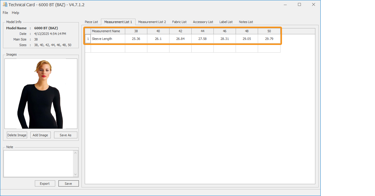 All desired measurements are added to the Technical Card in this way, and then saved to the Technical Card page using File > Save.
