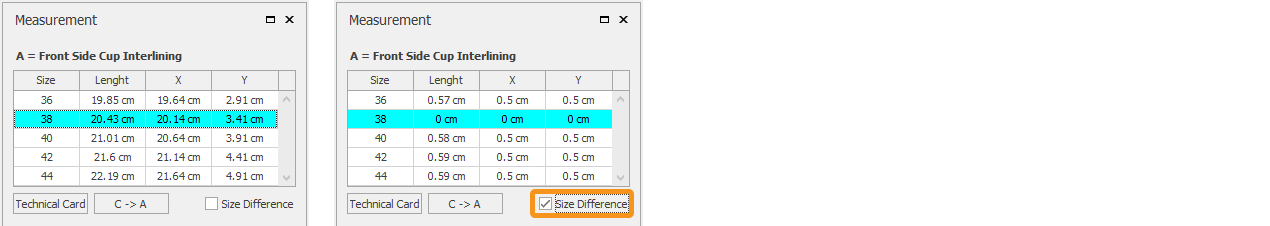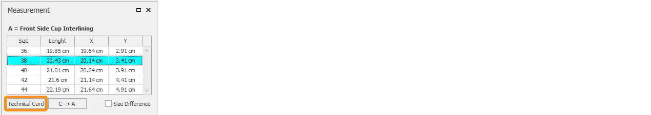 To send the measurement to the model’s Technical Card, click the Technical Card button. (Click here for Technical Card Transfer Operations)