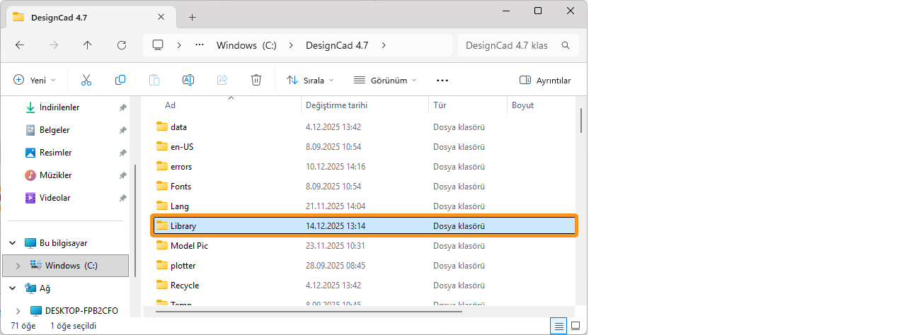 DesignCad 4.7 klasörü içine girilir, Library klasörü açılır.