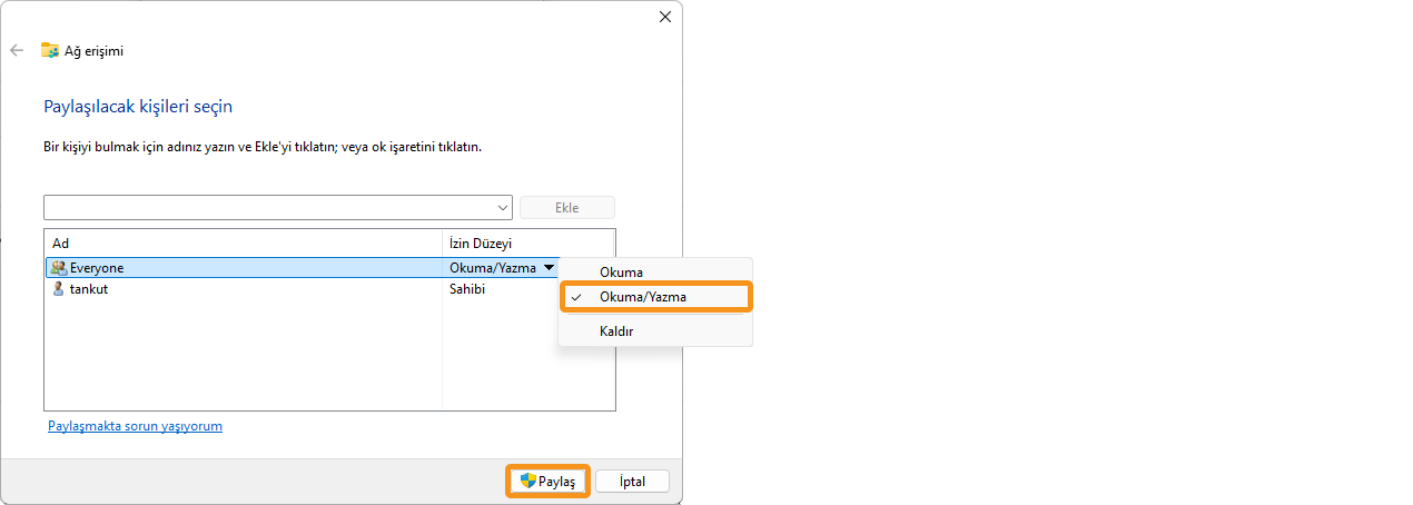 Everyone için izin düzeyi Okuma / Yazma olarak ayarlanır ve Paylaş butonuna tıklanarak paylaşım işlemi tamamlanır.