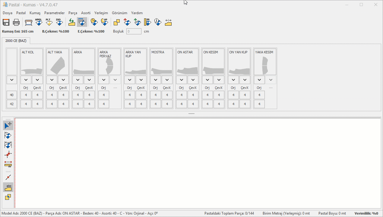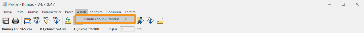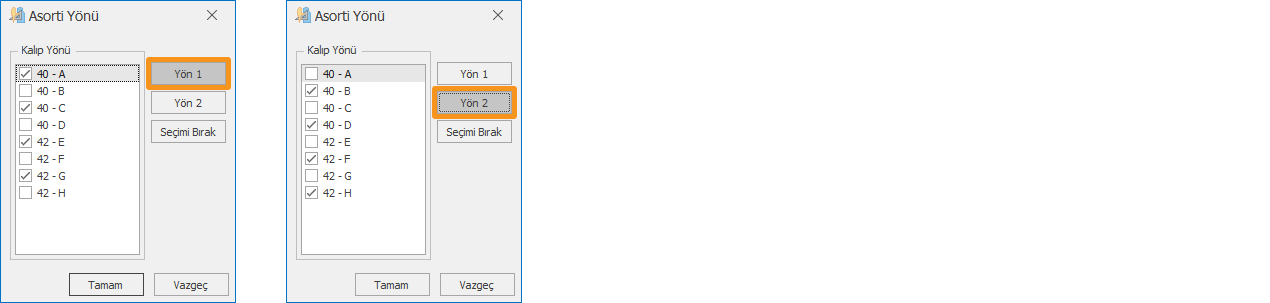 Örneğin; Ön astar parçasının 40. bedeni pastala dört adet olarak alınmıştır (40A, 40B, 40C, 40D). Asorti ekranında 40B ve 40D asortileri işaretlendiğinde, 40A ve 40C asortileri kalıp tasarım ekranında hazırlandığı orijinal yönünde gelirken, 40B ve 40D asortileri orijinal yönlerine göre 180 derece döndürülmüş olarak yerleşecektir.
