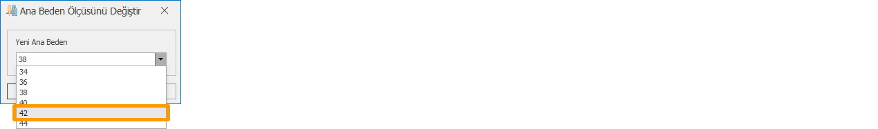 - Alınacak Beden kısmında seçilen yeni ana bedenin ölçüsünün hangi bedenden alınacağı seçilir.