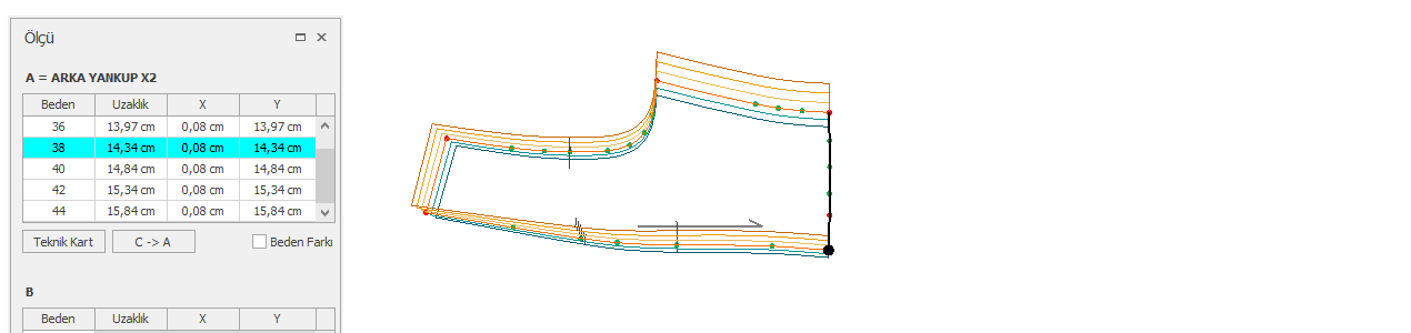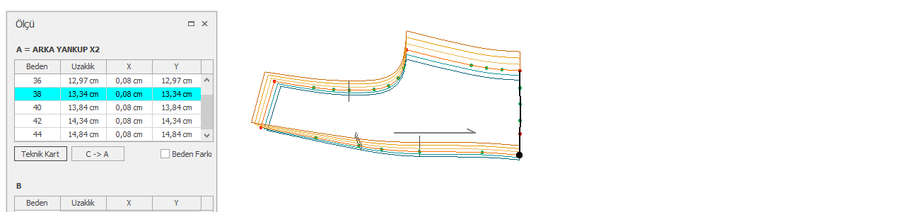 Örneğin: 38 bedende hattın ölçüsü 13,34 cm iken bu işlemden sonra 38 bedenin ölçüsü 14,34 cm olur.
