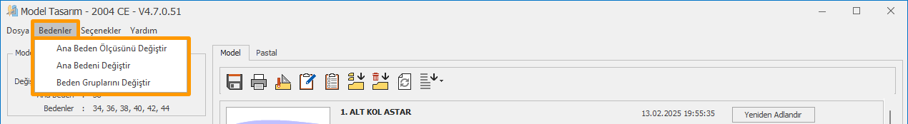 Model Tasarım ekranında Bedenler menüsü altında, bedenlerle ilgili üç farklı işlem yapılır.