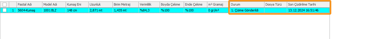 Çizim gönderildikten sonra, pastal satırındaki Durum bilgisi Bekliyor'dan 1.Çizime Gönderildi'ye döner ve çizim tarih ile saati satıra eklenir.