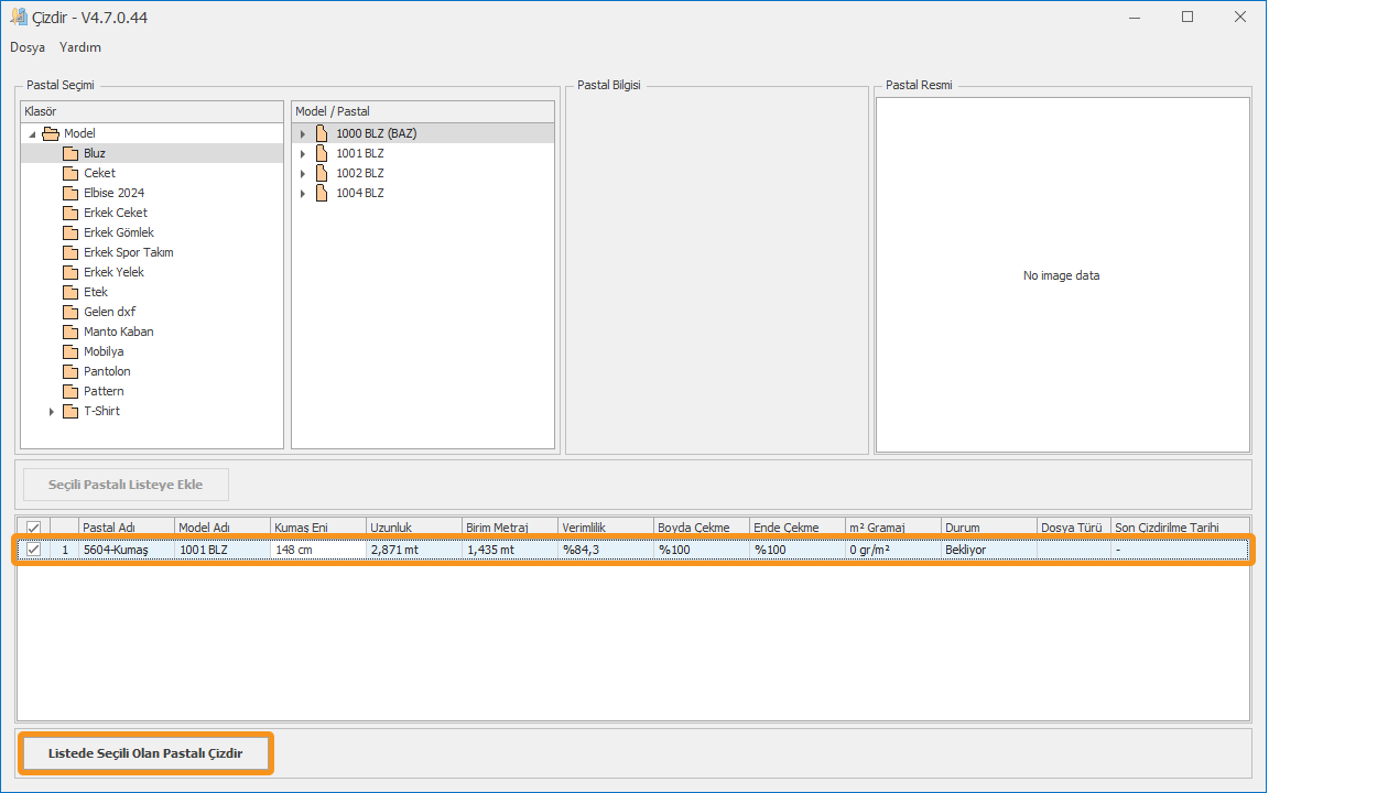 Çizdirilecek pastal dosyası durumu bekliyor olarak listeye eklenir, mouse ile seçilir ve sol alttaki Listede Seçili Olan Pastalı Çizdir butonu tıklanır.