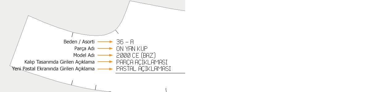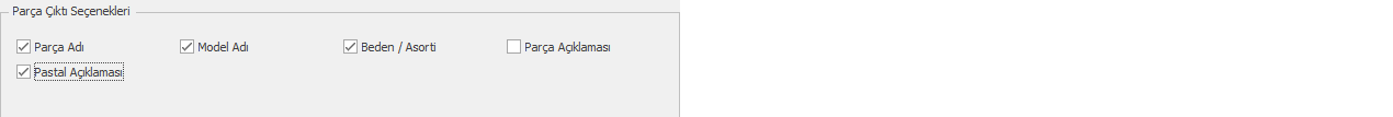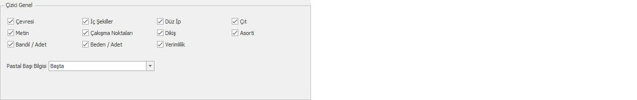 Parça Çıktı Seçenekleri bölümünden oluşturulan pastal dosyasındaki parçaların içinde yazan bilgi yazılarının hangilerinin yazıp yazmayacağı seçilir. işaretli olan özellik pastal çıktısında görünür, işareti kaldırılan özellik pastal çıktısında görünmez. (varsayılan hepsi işaretli gelir)
