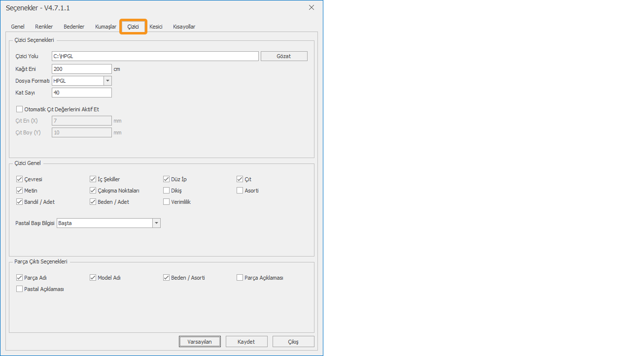 Çiziciye (plotter) gönderilen çizim dosyalarının nasıl gönderileceğinin, gönderilen dosyada pastala ait hangi bilgilerin olacağının belirlendiği sekmedir.