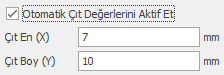 Otomatik Çıt Değerleri Aktif Et kutucuğu aktif hale getirilirse oluşturulan HPGL ve HP2 dosyalarındaki çıtların boyu Çıt En (X) ve Çıt Boy (Y) kutularına girilen değerler kadar olur. “Kalıp tasarım ekranında belirtilen çıt değerleri oluşturulan HPGL ve HP2 dosyalarına yansımaz.”