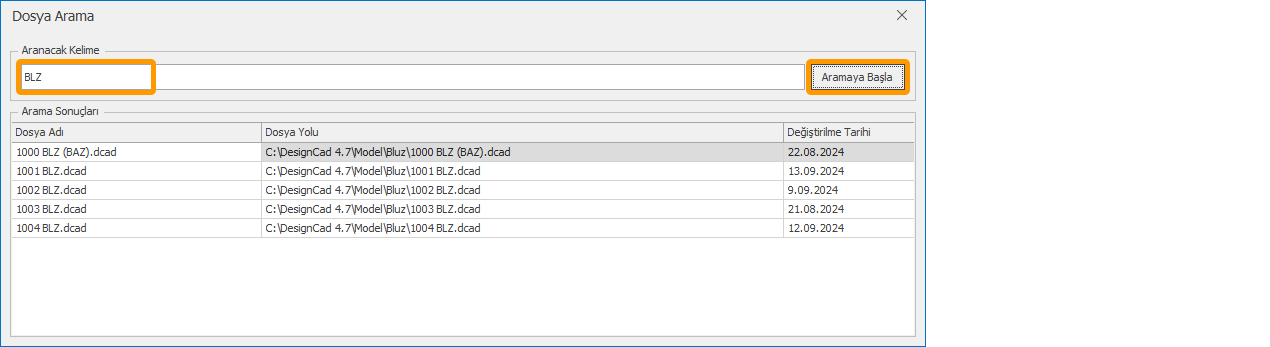 4.) Arama Sonuçları kısmında aranacak kelime bölümüne girilen harf veya kelimelerin içinde geçtiği dosyalar listelenir.