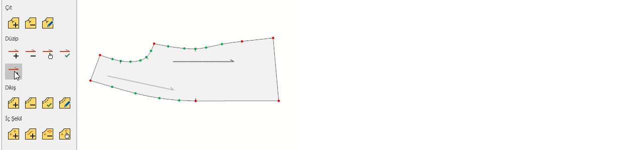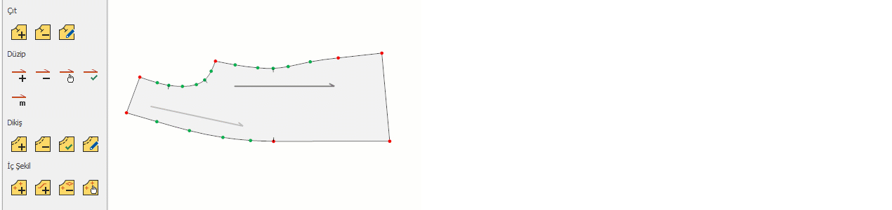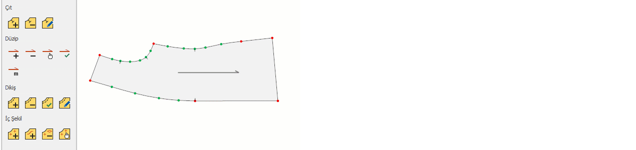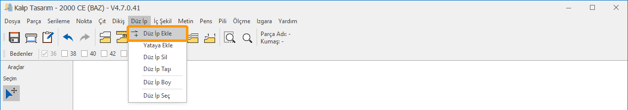 Yeni bir parça oluşturulduğunda veya dışarıdan DXF dosyası olarak kalıp alındığında, düz ip parça içinde otomatik olarak oluşur. Ancak bazı durumlarda, Fotodijit'ten kalıp alınırken düz ip eklenmeden alındığında ya da parçaya ikinci bir düz ip eklenmek istendiğinde, Düz İp Ekle özelliği kullanılabilir.