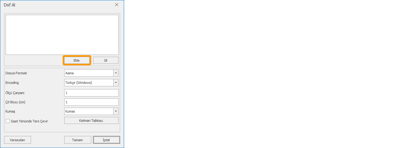 3.) DXF Al penceresi açıldığında, Ekle butonuna tıklanır ve açılan pencereden aktarılacak DXF dosyası seçilir.