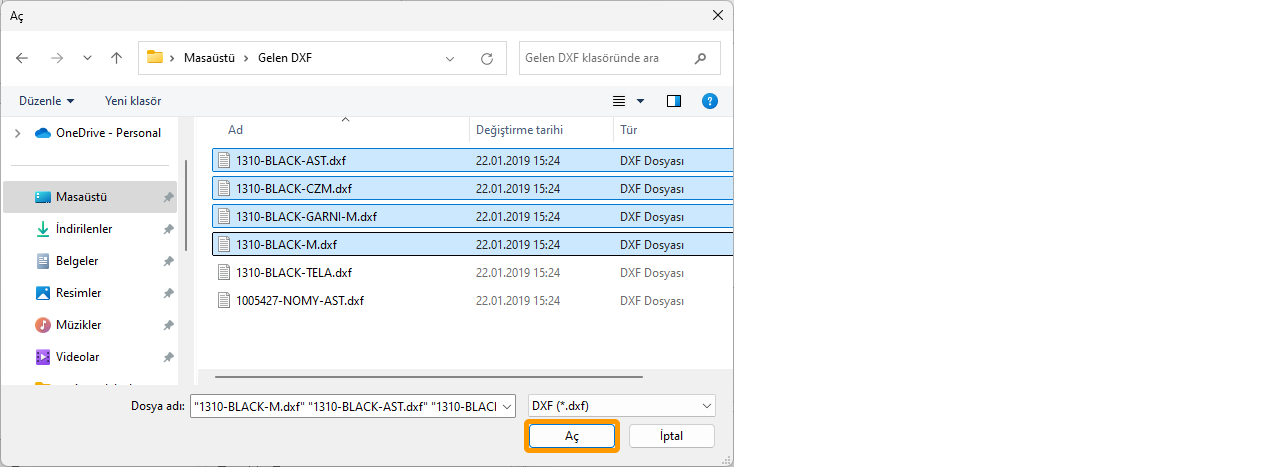 4.) Alınacak DXF dosyasını seçtikten sonra, Aç butonuna tıklayarak dosyayı DXF Al ekranına aktarın. Birden fazla dosya seçmek isterseniz, klavyenizden Shift veya Ctrl tuşlarına basılı tutabilirsiniz.
