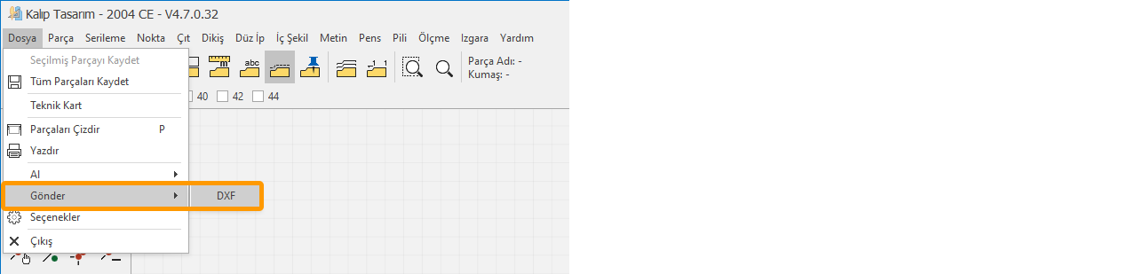 2.) Kalıp Tasarım ekranında Dosya menüsünden Gönder > DXF tıklanır.