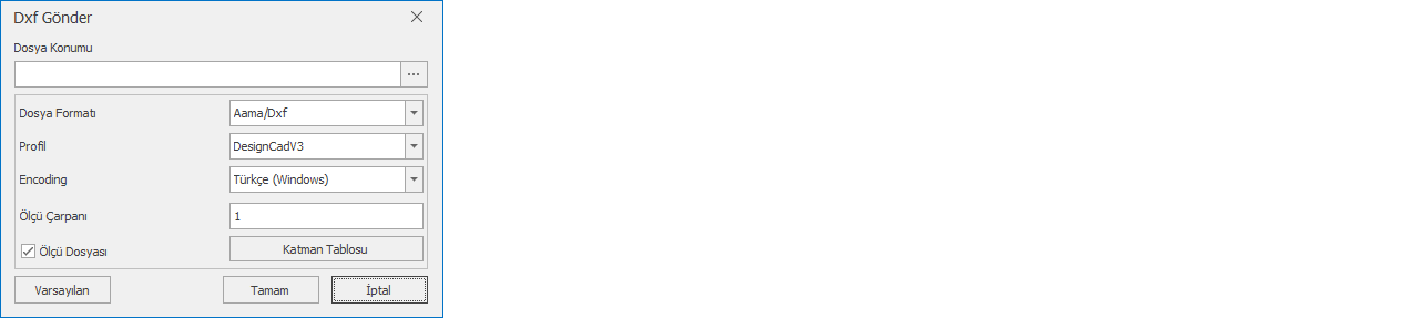 | Ölçü Çarpanı | Gerekli durumlarda, gönderilen DXF dosyasının ölçü katsayısı değiştirilir. Örneğin, ölçü çarpanı olarak 10 girilirse, 1 cm dosyada 10 cm olarak kaydedilir. |