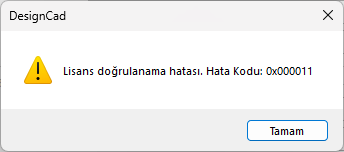 Bilgisayarınızda herhangi bir donanım (HDD, anakart vb.) değişikliği veya yeni bir bilgisayara kurulum yapmak istediğinizde, DesignCad yazılımı ilk lisanslamada tanımlanan donanımdan farklı bir donanım algılar ve açılışta Lisans Doğrulama Hatası mesajını verir.